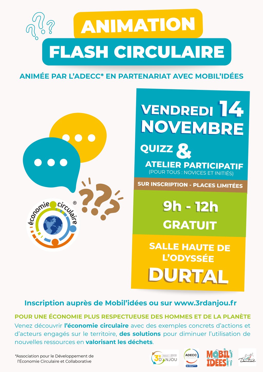 Dans le cadre de la Semaine EuropĂ©enne de la RĂ©duction des DĂ©chets, les 3RDâAnjou et lâADECC (Association pour le DĂ©veloppement de lâĂconomie Circulaire et Collaborative) vous invitent Ă une animation originale et participative :