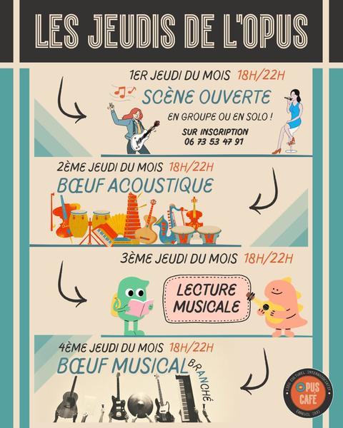 Tous les jeudis soir, l'Opus Café vous propose des soirées musicales variées ! Scène ouverte, bœuf acoustique, lecture musicale et bœuf musical branché. Ambiance conviviale garantie.