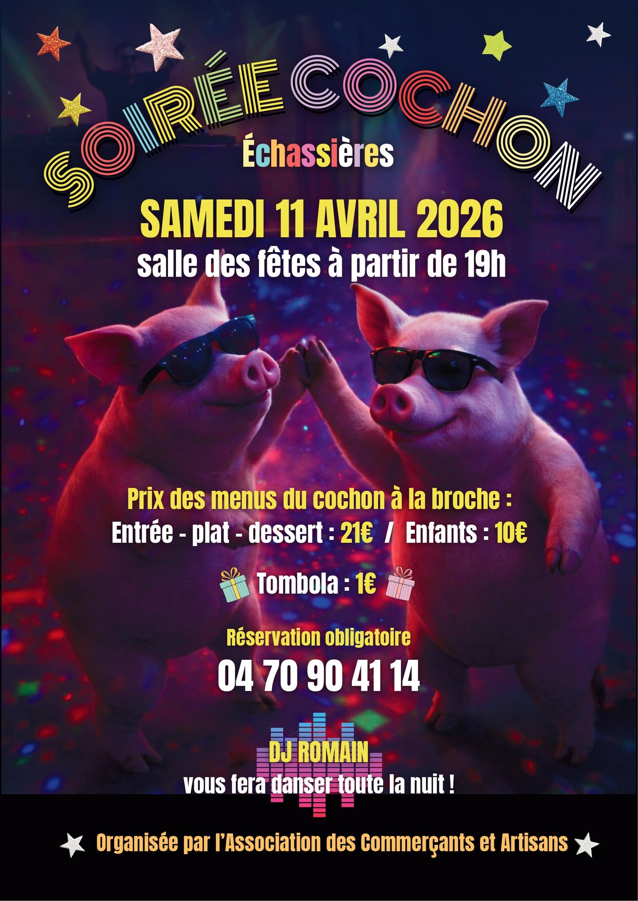 L'association des artisans et commerçants organise une soirée cochon le 11 avril 2026 au centre socioculturel Danièle Chammartin à Echassières à partir de 19 h.