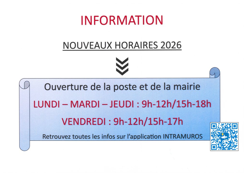 À partir de 2026, de nouveaux horaires sont mis en place : la mairie et l’agence postale seront ouvertes de façon synchronisée, 4 jours par semaine.