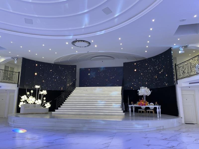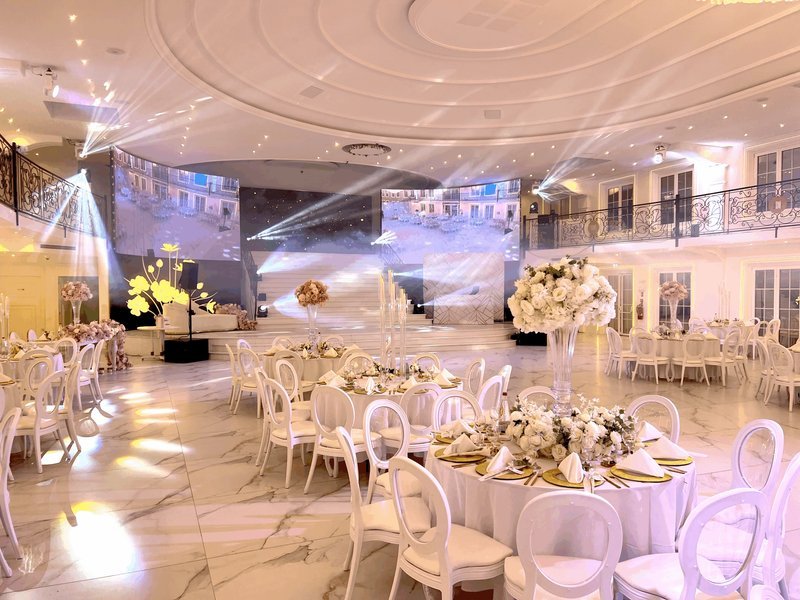 Imaginez une salle majestueuse aux hauteurs sous plafond vertigineuses, illuminée par des lustres d'exception et sublimée par des balcons ornementaux. Le grand escalier monumental, drapé de lumières féeriques, s'élève majestueusement dans une décoration inspirée du style haussmannien. Trois podiums, un système d'éclairage LED de dernière génération et trois loges privées pour les mariés complètent ce cadre exceptionnel.