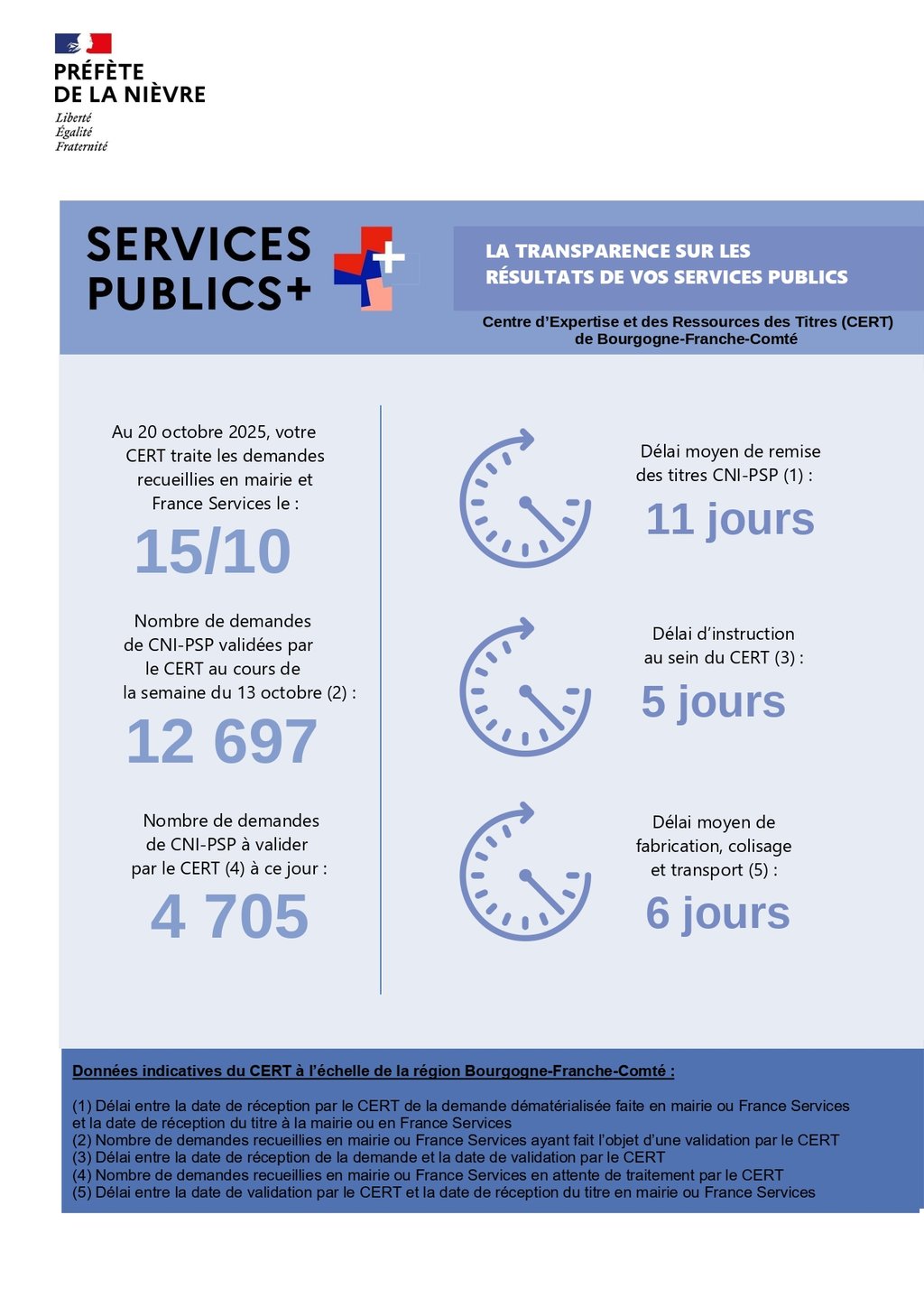 À cet effet la préfecture de la Nièvre qui instruit les demandes de carte d'identité et passeport pour les départements 21, 25, 39, 58, 70, 71, 89, 90 à publier une affiche concernant ces fameux indicateurs de délai d'obtention pour un titre d'identité. (affiche à retrouver ci-dessous)