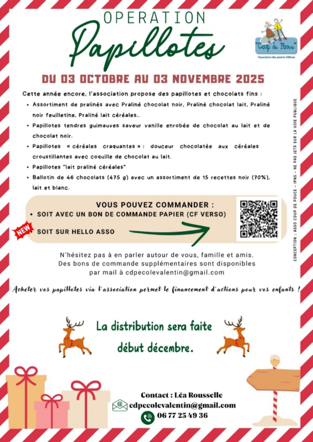 Remplissez et déposer votre bon de commande avec le règlement pour le lundi 03 novembre au plus tard en déposant votre bon dans la boîte aux lettres 📭de l'association (située à côté école maternelle), auprès des enseignantes ou directement sur le site Hello asso à l'adresse : https://www.helloasso.com/associations/coup-de-pouce-ev/boutiques/papillotes