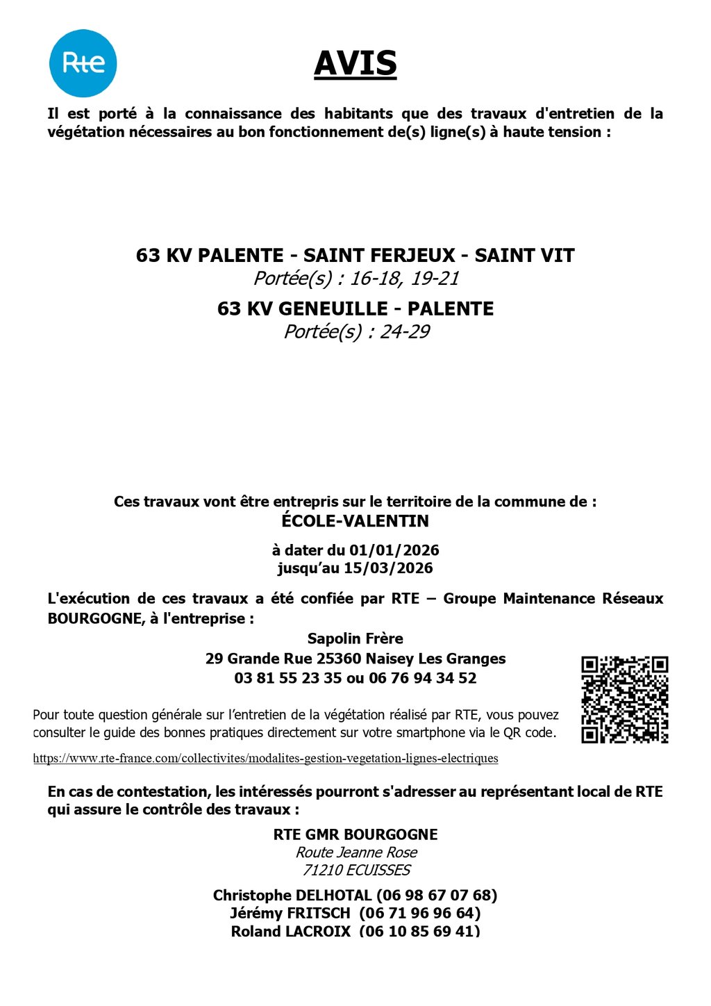 Nous vous informons que des travaux d'entretien de la végétation près des lignes hautes tensions vont être entrepris par la société Sapolin Frères mandatée par RTE.