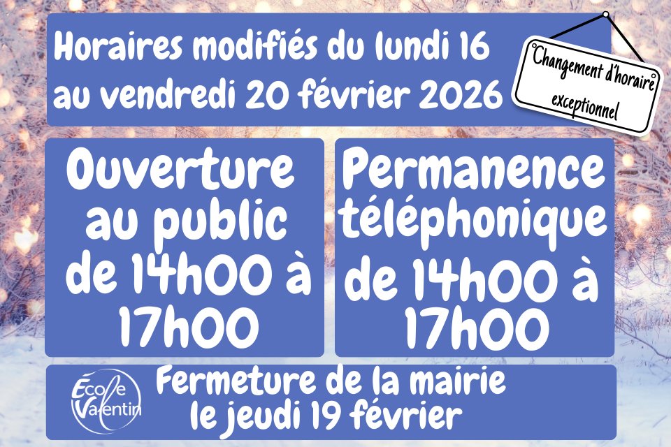 Du lundi 16 au vendredi 20 février, la mairie d’Ecole-Valentin sera ouverte au public de 14h00 à 17h00