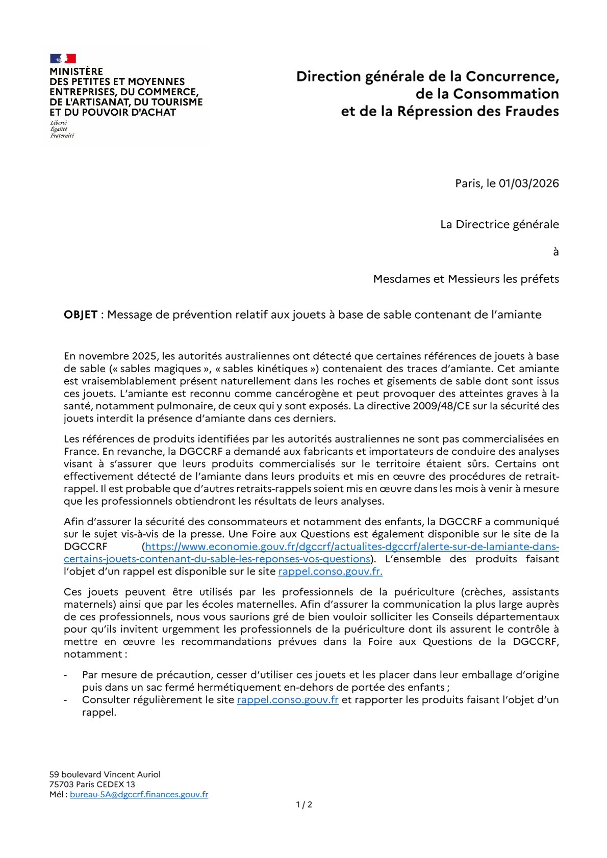 Avertie de la présence d’amiante dans certains jouets à base de sable, la DGCCRF a informé les professionnels de la nécessité de suspendre la commercialisation de l’ensemble des jouets à base de sable. Il leur appartient de s’assurer que ces jouets ne contiennent pas d’amiante avant de les proposer de nouveau à la vente. La DGCCRF recommande aux parents de ne pas acheter de jouets contenant du sable et de ne plus utiliser ce type de jouets s’ils en possèdent déjà. Cette mesure vise à écarter les enfants de toute exposition potentielle à l’amiante.