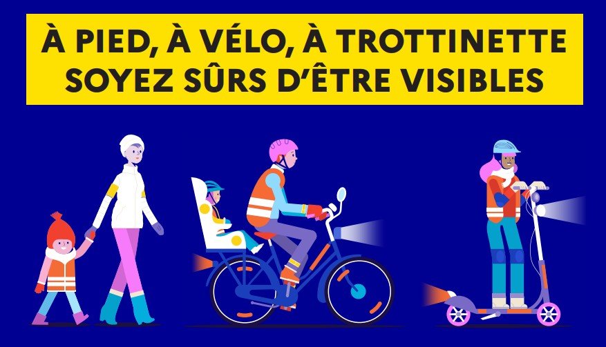 A vélo, à trottinette, le port du gilet rétroréfléchissant est obligatoire de nuit ou de jour par visibilité insuffisante. Il n’est pas interdit pour les piétons, pensez y !