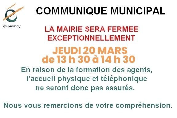 La mairie sera exceptionnellement fermée ce jour de 13 h 30 à 14 h 30 en raison de la formation des agents.