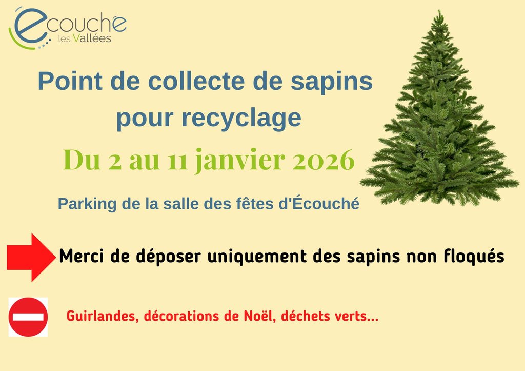 Du 2 au 11 janvier 2026, déposez vos sapins de Noël au point de collecte pour recyclage, situé sur le parking de la salle des fêtes d’Écouché.