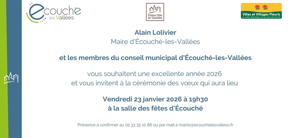 Rappel : les voeux du maire se dérouleront le vendredi 23 janvier 2026 à 19h30 à la salle des fêtes d'Écouché