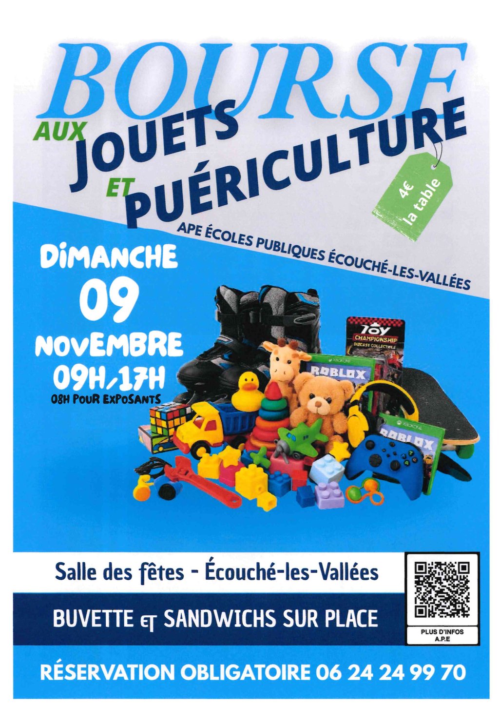 L'APE des écoles publiques d'Écouché-les-Vallées organise une bourse aux jouets le dimanche 9 novembre 2025, de 9h à 17h, à la salle des fêtes d'Écouché