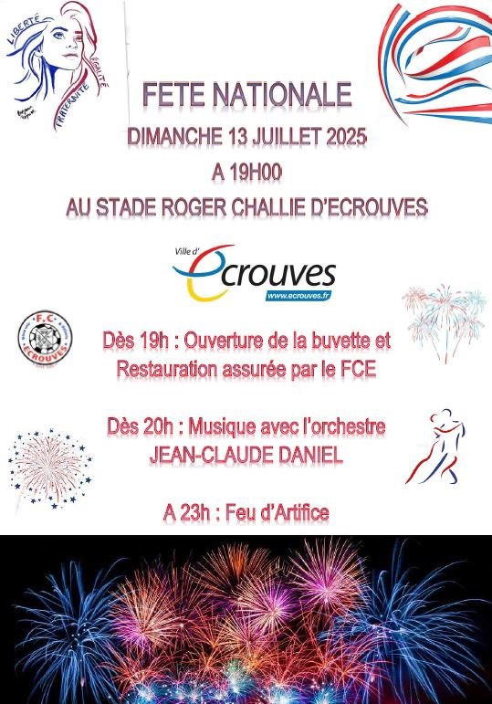 FÊTE NATIONALE DIMANCHE 13 JUILLET À 19H00 AU STADE MUNICIPAL ROGER CHALLIE D'ECROUVES !