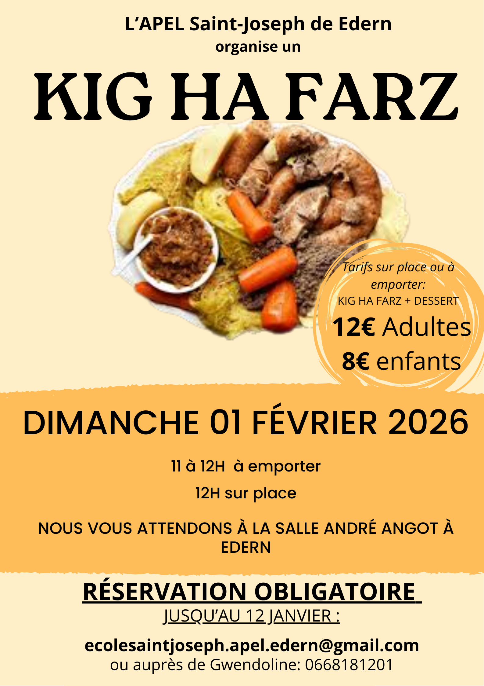 L'APEL de l'école St Joseph d'Edern vous propose un repas Kig Ha Farz le dimanche 1er février 2026, à la salle André Angot d'Edern.