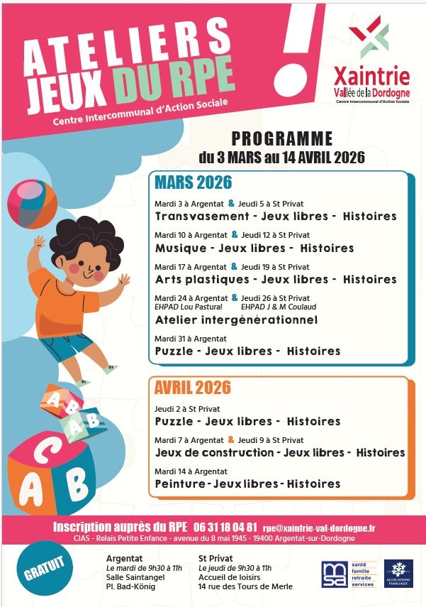 Inscriptions auprès du RPE au 06.31.18.04.81 ou rpe@xaintrie-val-dordogne.fr