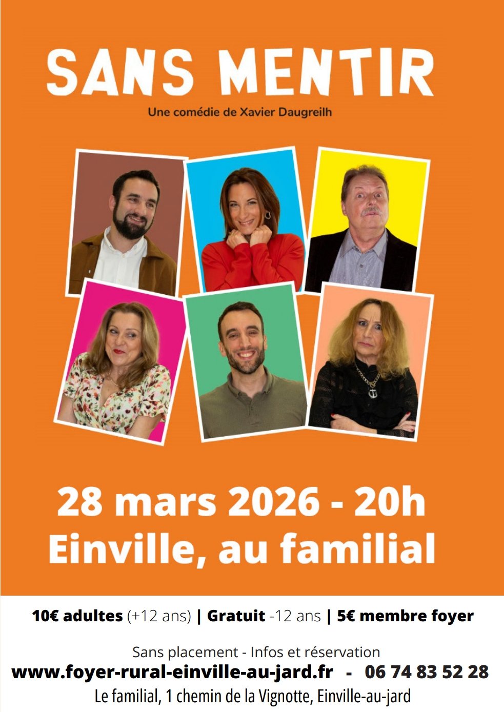 Rendez-vous le samedi 28 mars 2026 à 20h à la Salle des fêtes Le Familial à Einville-au-Jard pour une soirée placée sous le signe du rire et de la bonne humeur !