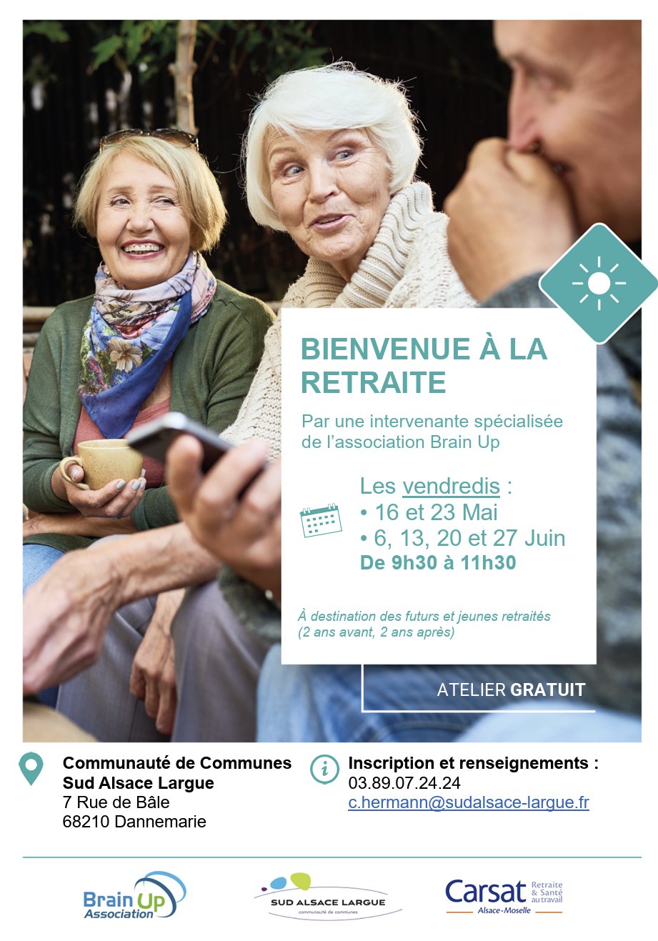 En partenariat avec l'association Brain Up, la CCSAL propose aux nouveaux retraités le programme "Bienvenue à la retraite" 👉 6 séances gratuites pour échanger et réfléchir ensemble aux changements liés à cette nouvelle étape (santé, relations, rythme de vie, activités...).