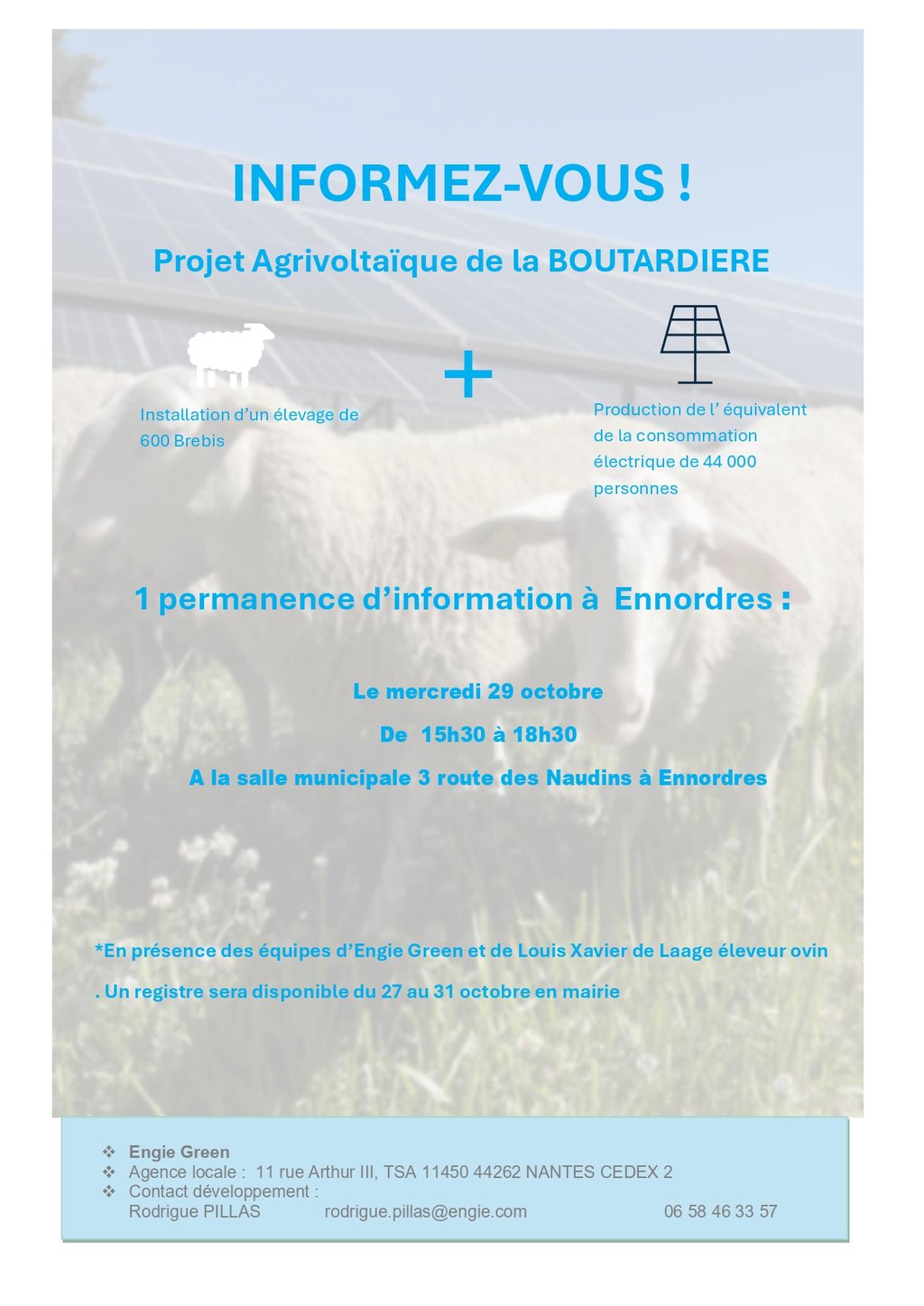 de 15h30 à 18h30 dans la Salle Municipale d'Ennordres concernant un projet Agrivoltaïque à La Boutardière.