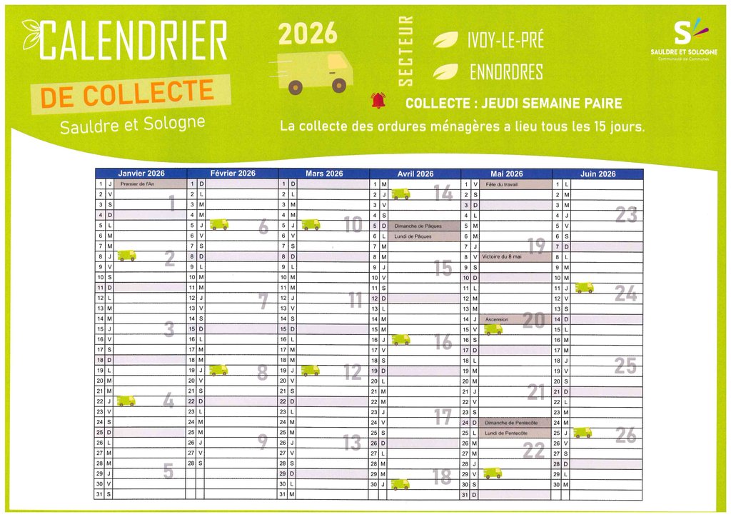 Je vous communique le calendrier de la collecte des ordures ménagères 2026.