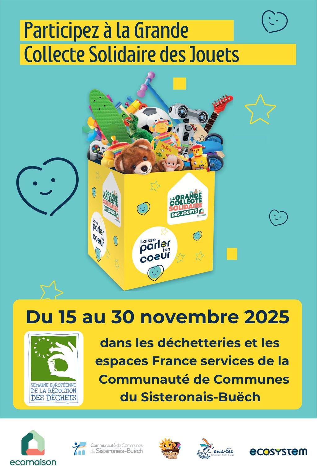 Du 15 au 30 Novembre 2025, dans le cadre de la Semaine Européenne de la Réduction des Déchets (SERD), la Communauté de communes du Sisteronais-Buëch (CCSB) en partenariat avec ecosystem, Ecomaison et les ressourceries locales (L'envolée et les Trésors du Soleil), organise une grande collecte de jouets d’occasion sur tout le territoire.
