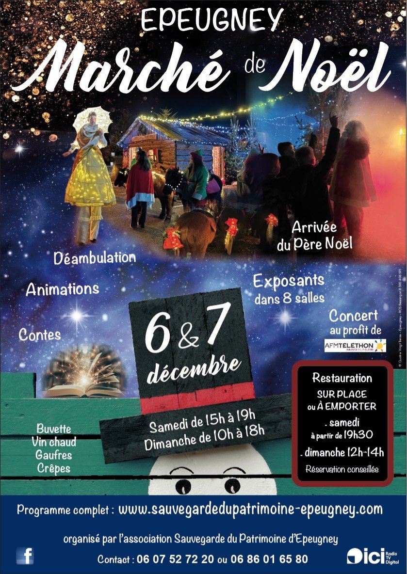 Venez nombreux au Marché de Noël d'Epeugney ! Des exposants répartis dans 8 salles au centre du village (artisanat, produits régionaux...), la “Maison du Père Noël“ et de nombreuses animations ! A ne pas manquer : une déambulation en lumière avant l'arrivée surprise du Père Noël !