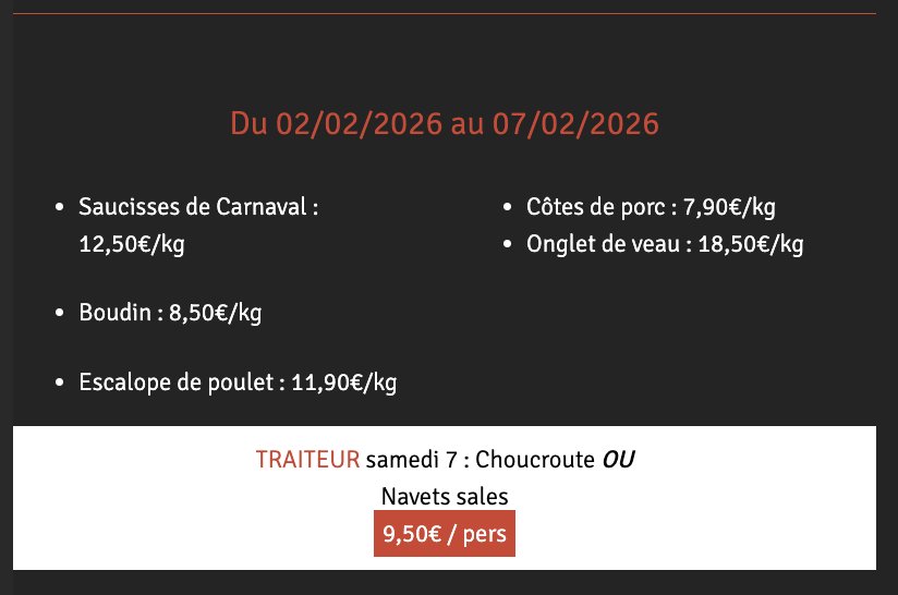 La Boucherie Charcuterie Mathis d'Epfig vous propose ce samedi 7 février 2026 au tarif de 9,50€ / personne :