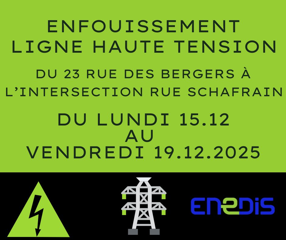À compter de ce lundi 15 Décembre et jusqu'au vendredi 19 décembre 2025, l'entreprise "TAMAS" va procéder à l'enfouissement de la ligne HTA (Haute tension) Rue des Bergers.