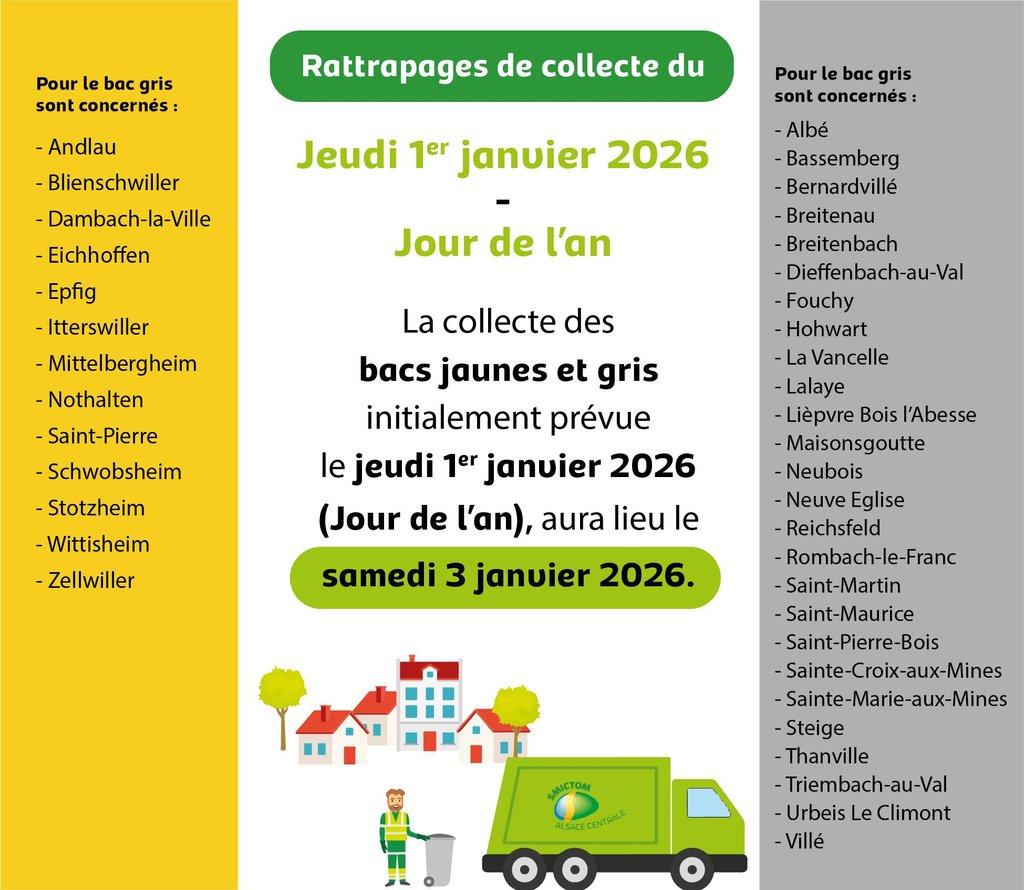 En raison du jeudi 1er janvier 2026 férié, les collectes des bacs jaunes et gris prévues ce jour-là seront organisées le samedi 3 janvier 2026.