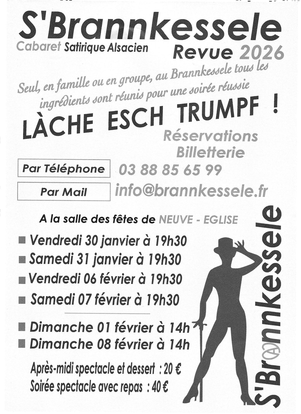 Vivez un moment inoubliable au cabaret satirique alsacien "S'BRANNKESSELE" à la salle des fêtes de NEUVE-ÉGLISE.