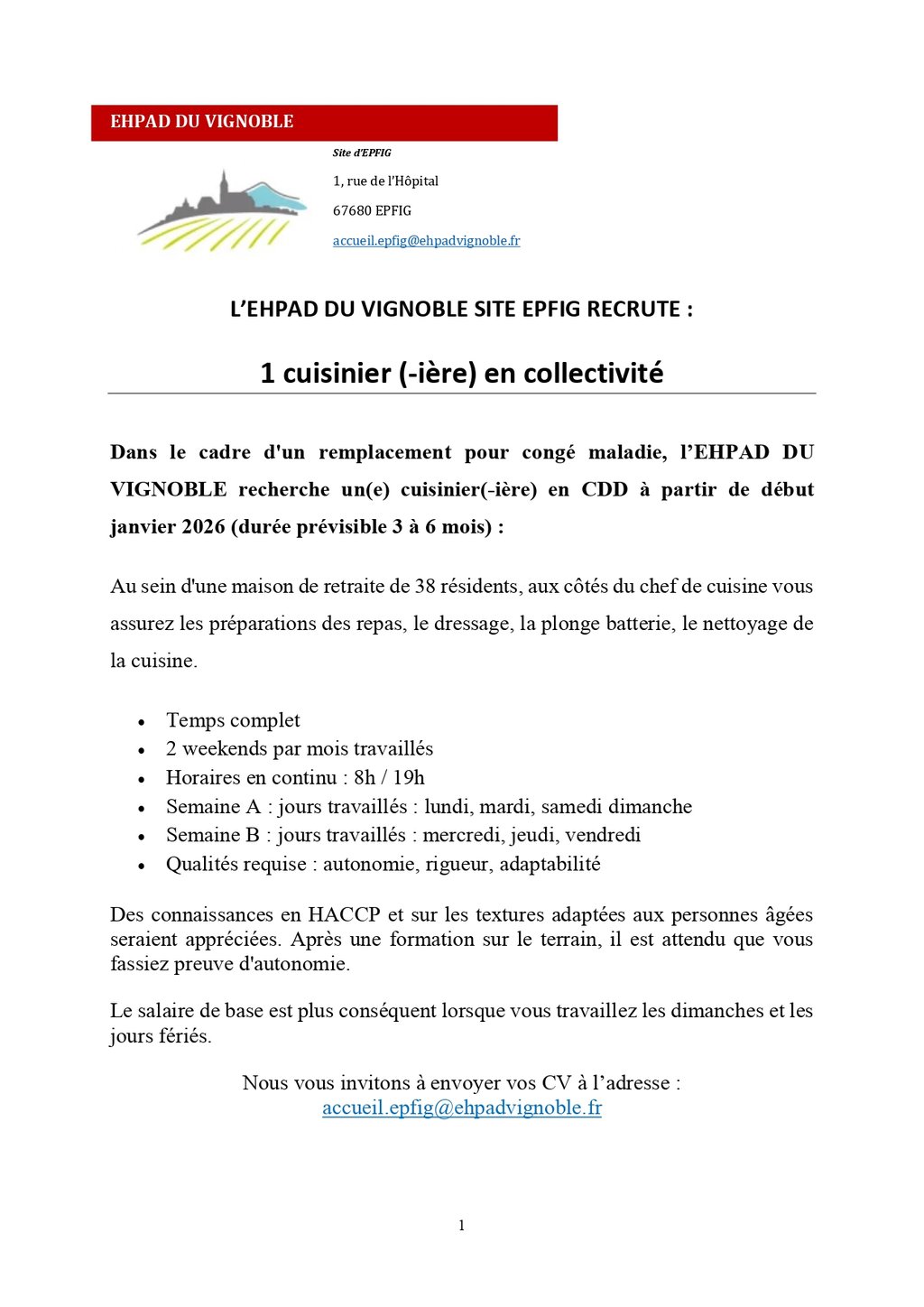 Nous vous invitons à envoyer vos CV à l’adresse : accueil.epfig@ehpadvignoble.fr
