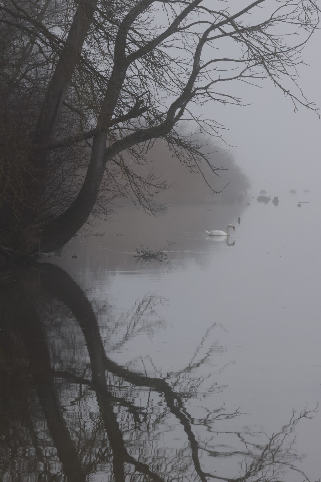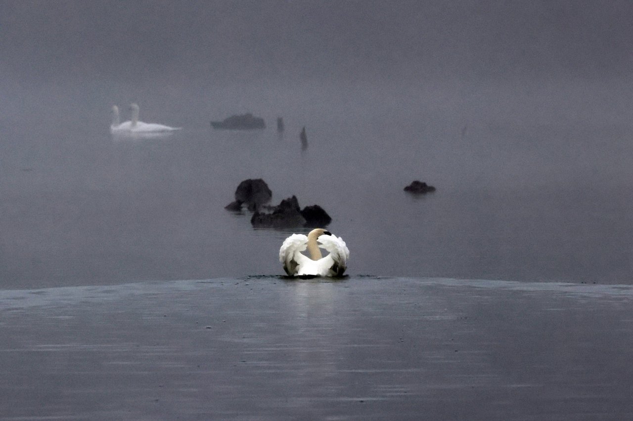 La grâce aquatique : Des cygnes majestueux glissant sur l'eau, symboles de pureté dans le fracas ambiant.