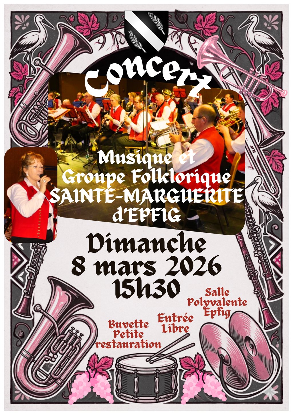 La Musique et le Groupe Folklorique SAINTE MARGUERITE ont le plaisir de vous inviter à leur CONCERT D'HIVER qui aura lieu le Dimanche 8 Mars 2026 à 15h30 à la Salle Polyvalente d'EPFIG.