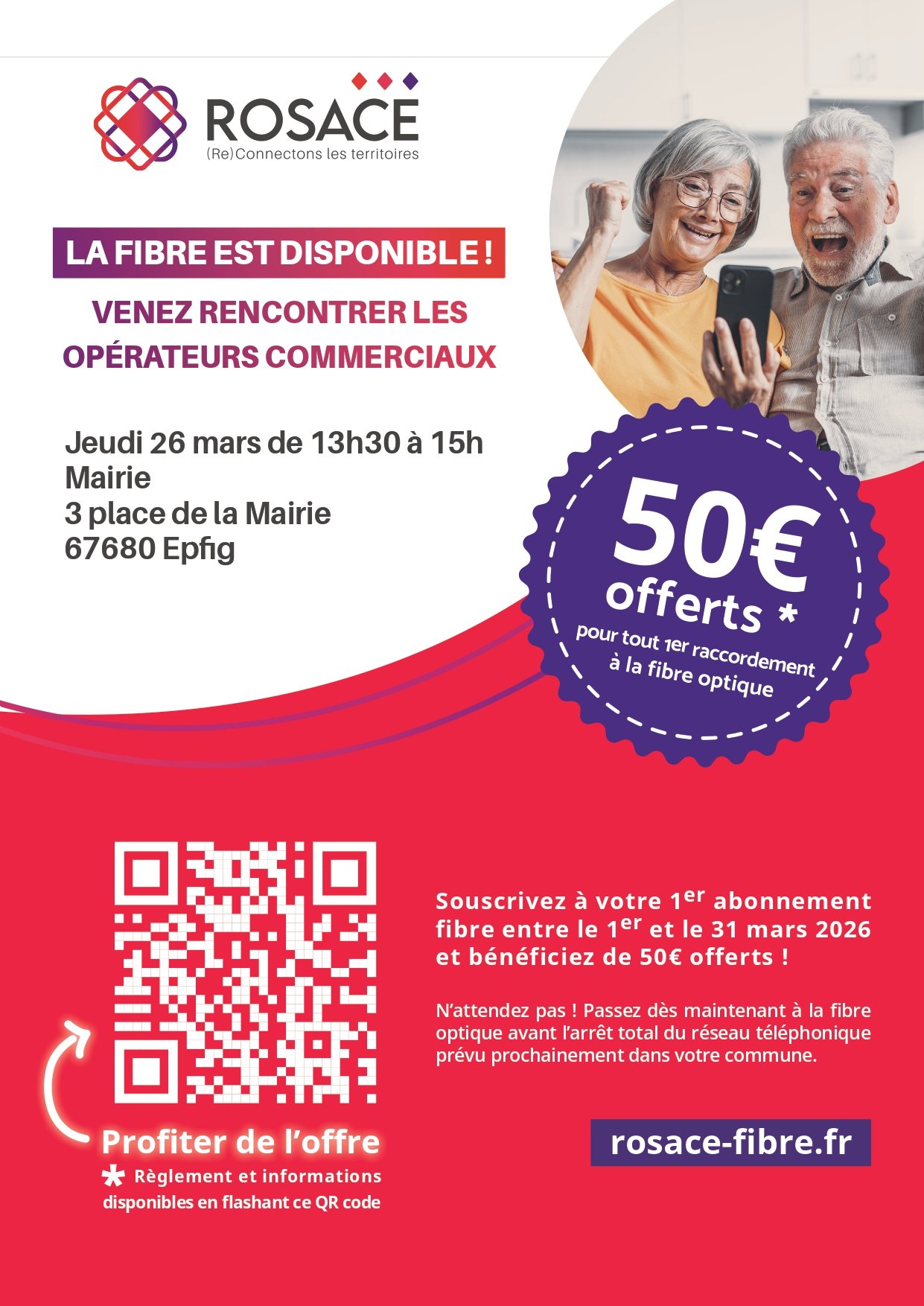 Une permanence sur l'arrêt du cuivre se tiendra dans la salle du rez-de-chaussée de la Mairie d'Epfig le jeudi 26 mars 2026 de 13h30 à 15h00, sans rendez-vous, en présence de ROSACE, et avec tous les Opérateurs de Télécom, pour anticiper cette transition et répondre à vos interrogations.