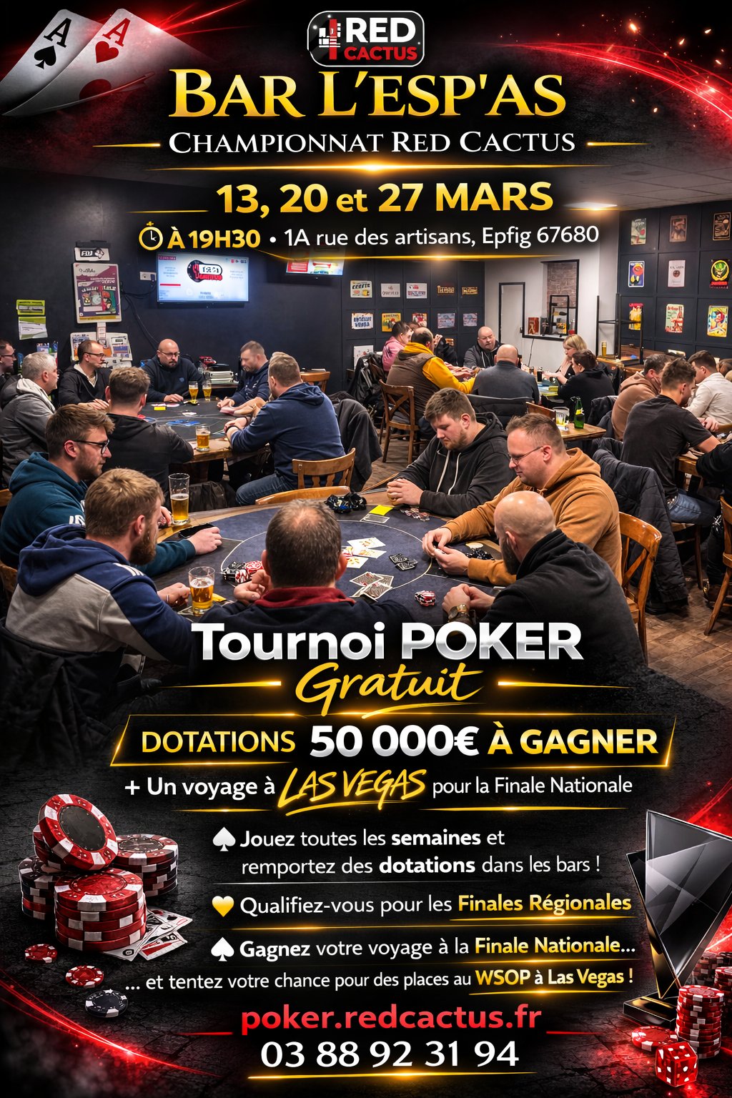 Tournois de Poker RED CACTUS les 13, 20 et 27 mars 2026 à partir de 19h30 à L'ESP'AS
