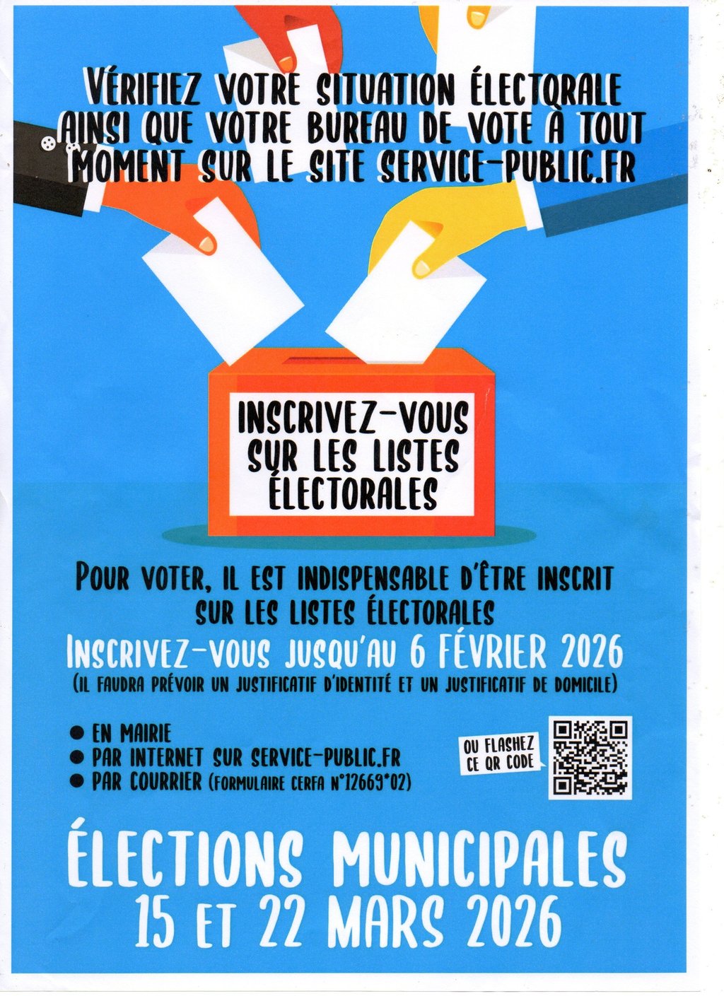Pour pouvoir voter aux prochaines élections, il est nécessaire de vous inscrire sur les listes électorales de la commune. L’inscription sur les listes électorales peut être réalisée en ligne jusqu’au vendredi 06 février 2026.
