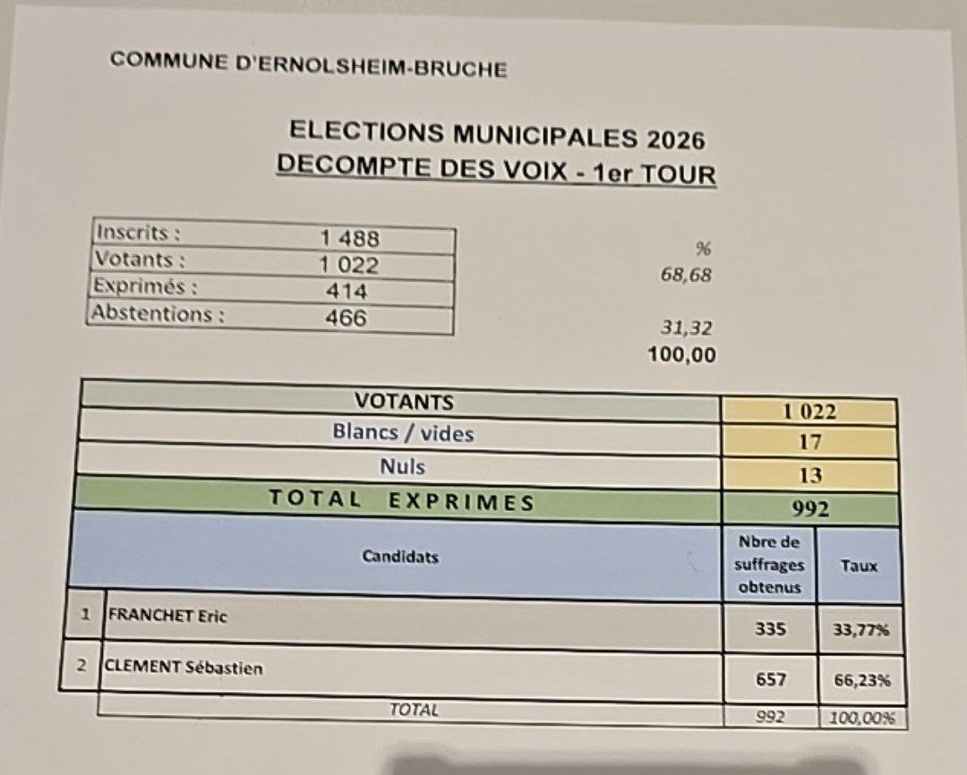 Vous trouverez le résultat des élections municipales dans l'image jointe.