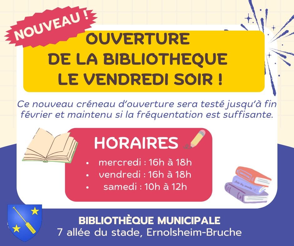 À partir du 7 novembre, la bibliothèque ajoute un créneau d'ouverture le vendredi soir, de 16h à 18h.