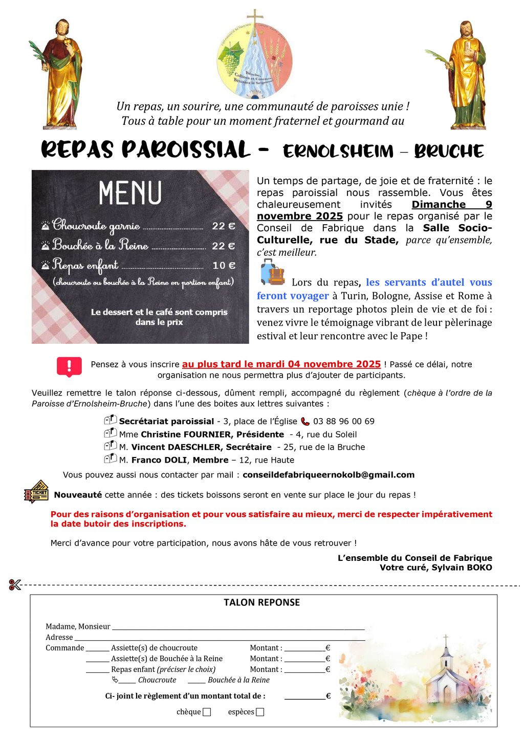 Vous êtes chaleureusement invités Dimanche 9 novembre 2025 pour le repas organisé par leConseil de Fabrique dans la Salle Socio-