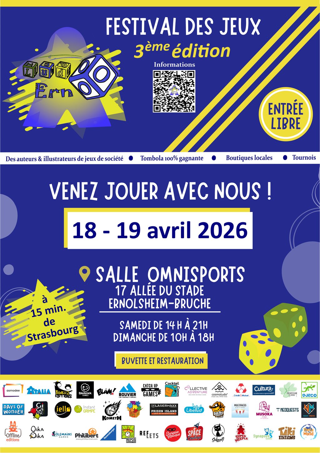 L'association Ludimagine est heureuse de vous annoncer la troisième édition du festival des jeux Ludo'Erno qui aura lieu le 18 et 19 avril 2026 à la salle omnisports d'Ernolsheim-sur-Bruche.