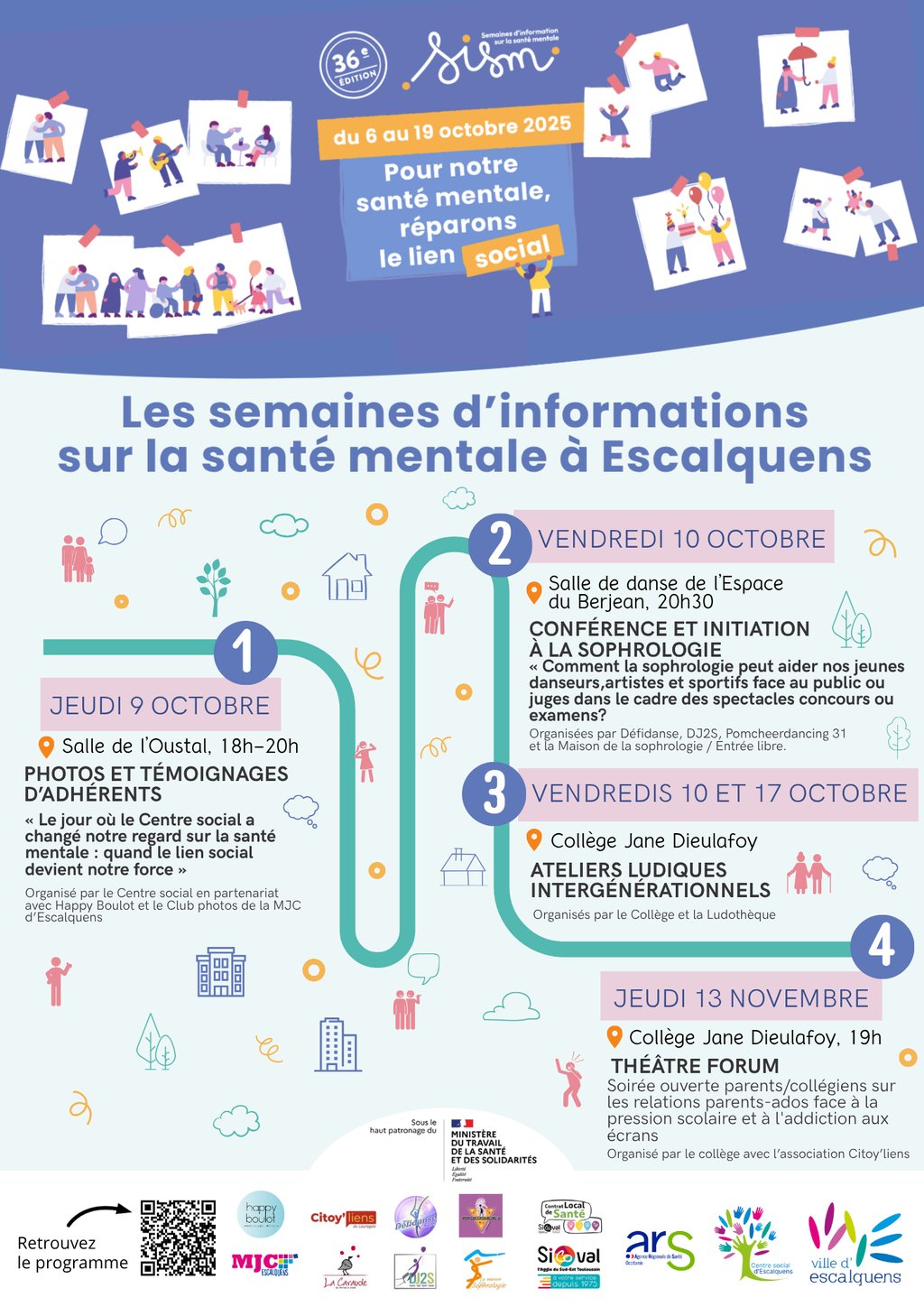 À cette occasion, la Ville d'Escalquens s'engage et propose une série d'actions pour contribuer à briser les tabous, déconstruire les préjugés et proposer des solutions concrètes pour restaurer la force du lien social comme ressource de santé :