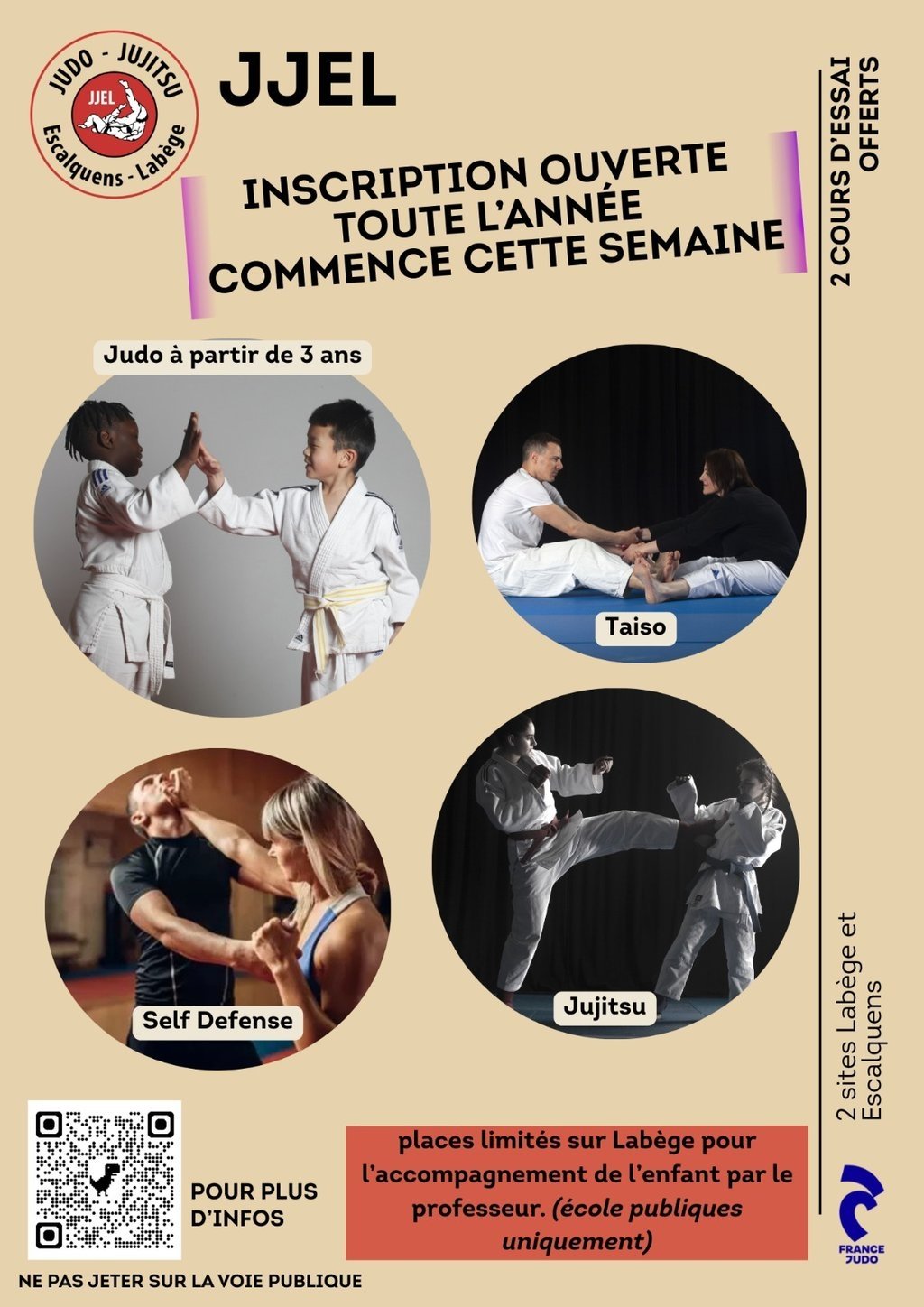 Inscription ouverte toute l'année : cours de judo, jujitsu, self défense et taïso.