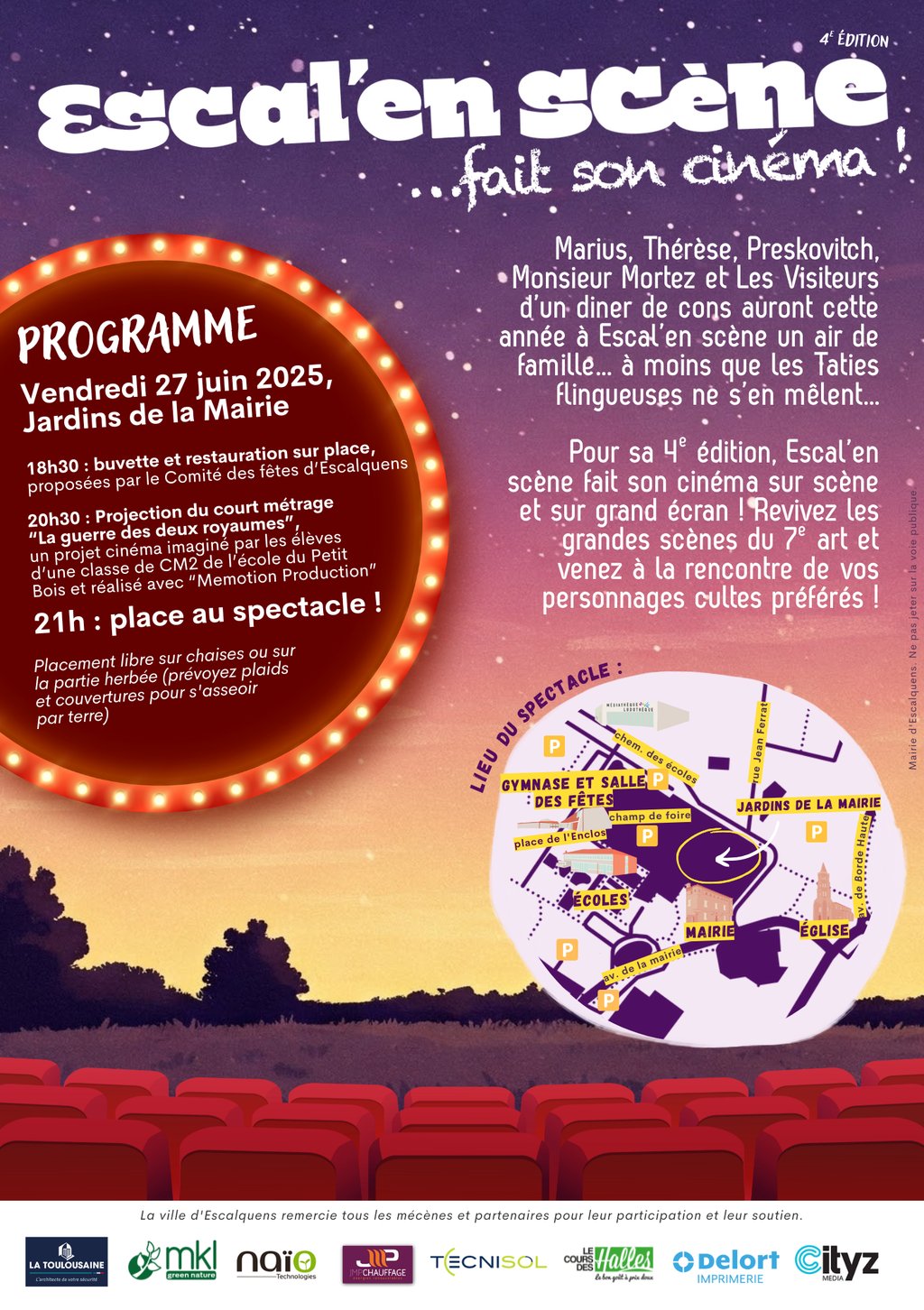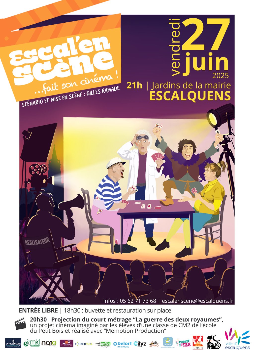 🌟 21h : place au spectacle Escal’en scène, écrit et mis en scène par Gilles Ramade ! Revivez les scènes cultes du cinéma revisitées par des amateurs passionnés : de Marius au Dîner de cons, en passant par Les Tontons flingueurs et Le Père Noël est une ordure 🎬🤣