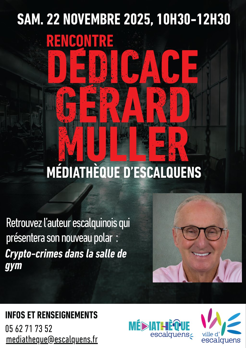 Le samedi 22 novembre à 10h30, venez rencontrer Gérard Muller qui présentera et dédicacera son nouveau polar "Crypto-crimes dans la salle de gym"à la médiathèque d'Escalquens.