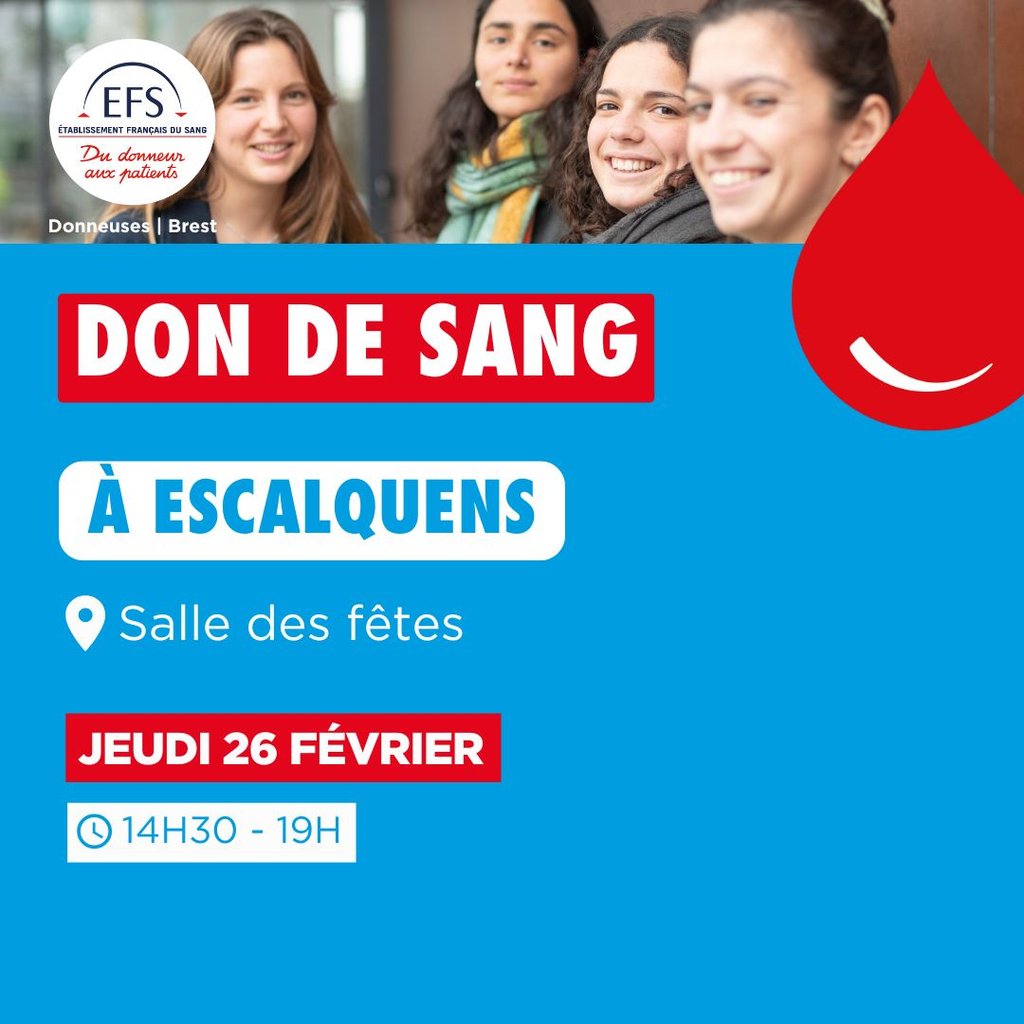 La collecte de sang 𩞠revient à Escalquens le jeudi 26 février 2026.