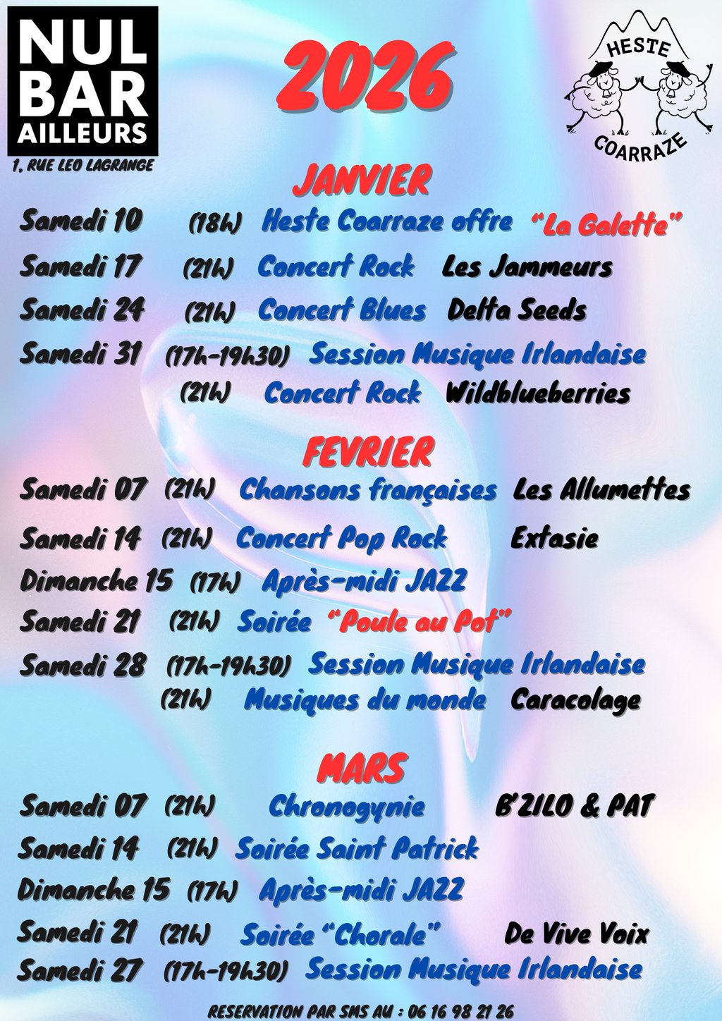 Voici le programme des animations au "Nul Bar Ailleurs" pour le 1ᵉʳ trimestre 2026.