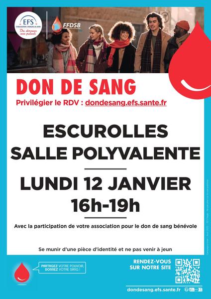 Donnez votre sang, sauvez des vies ! L'EFS organise une collecte de sang à Escurolles. Un geste solidaire et citoyen qui peut sauver jusqu'à 3 vies. Venez nombreux, munissez-vous d'une pièce d'identité. Privilégiez le RDV en ligne pour plus de rapidité !