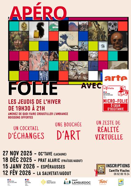 Un nouveau concept débarque : l’Apéro-Folie, un moment convivial pour discuter d’art — au sens très large — autour d’un apéritif dînatoire partagé ! Un jeudi par mois de novembre à février sur 4 communes différentes.
