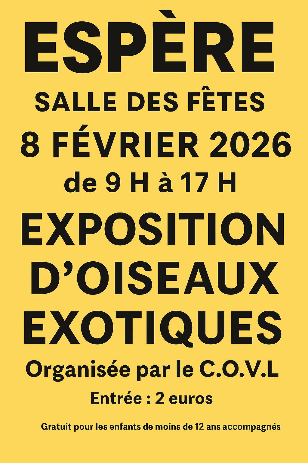 La commune dâEspĂšre a le plaisir dâaccueillir une exposition exceptionnelle dâoiseaux exotiques organisĂ©e par le C.O.V.L !