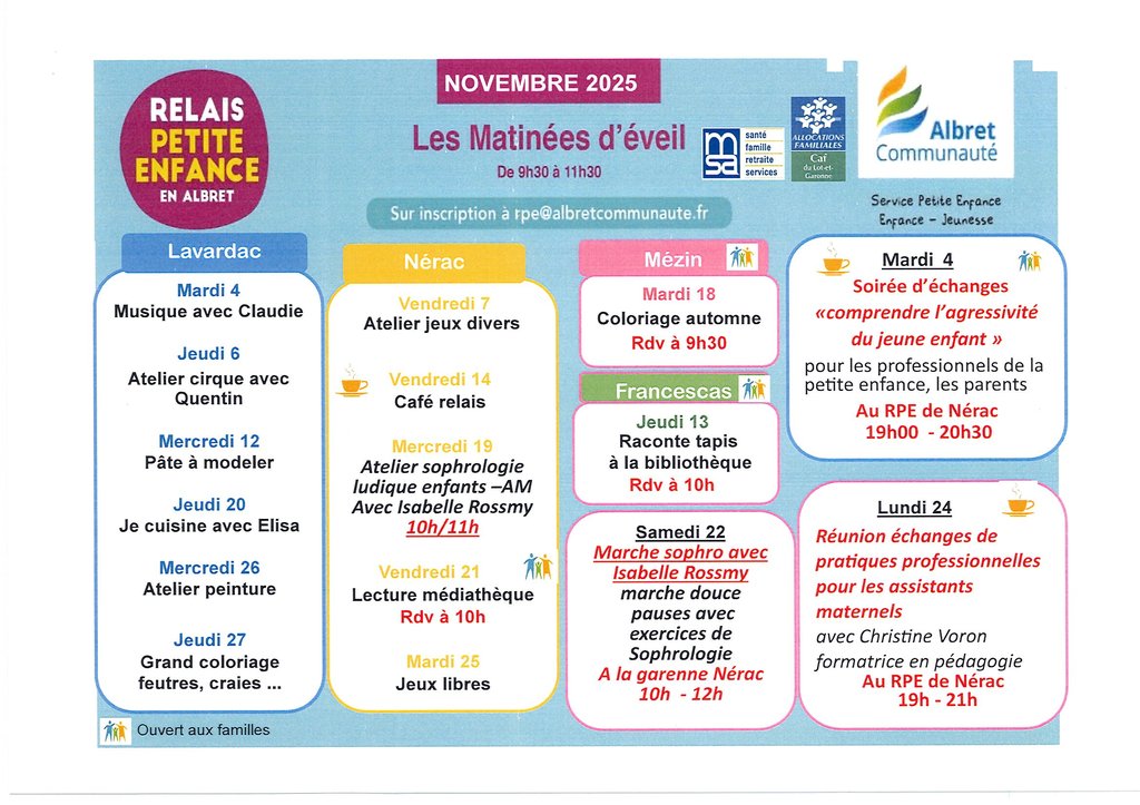 Les inscriptions se font à la semaine, au plus tard le jeudi pour la semaine suivante, en contactant le RPE de Nérac au 05.53.65.21.91 ou par mail rpe@albretcommunaute.fr