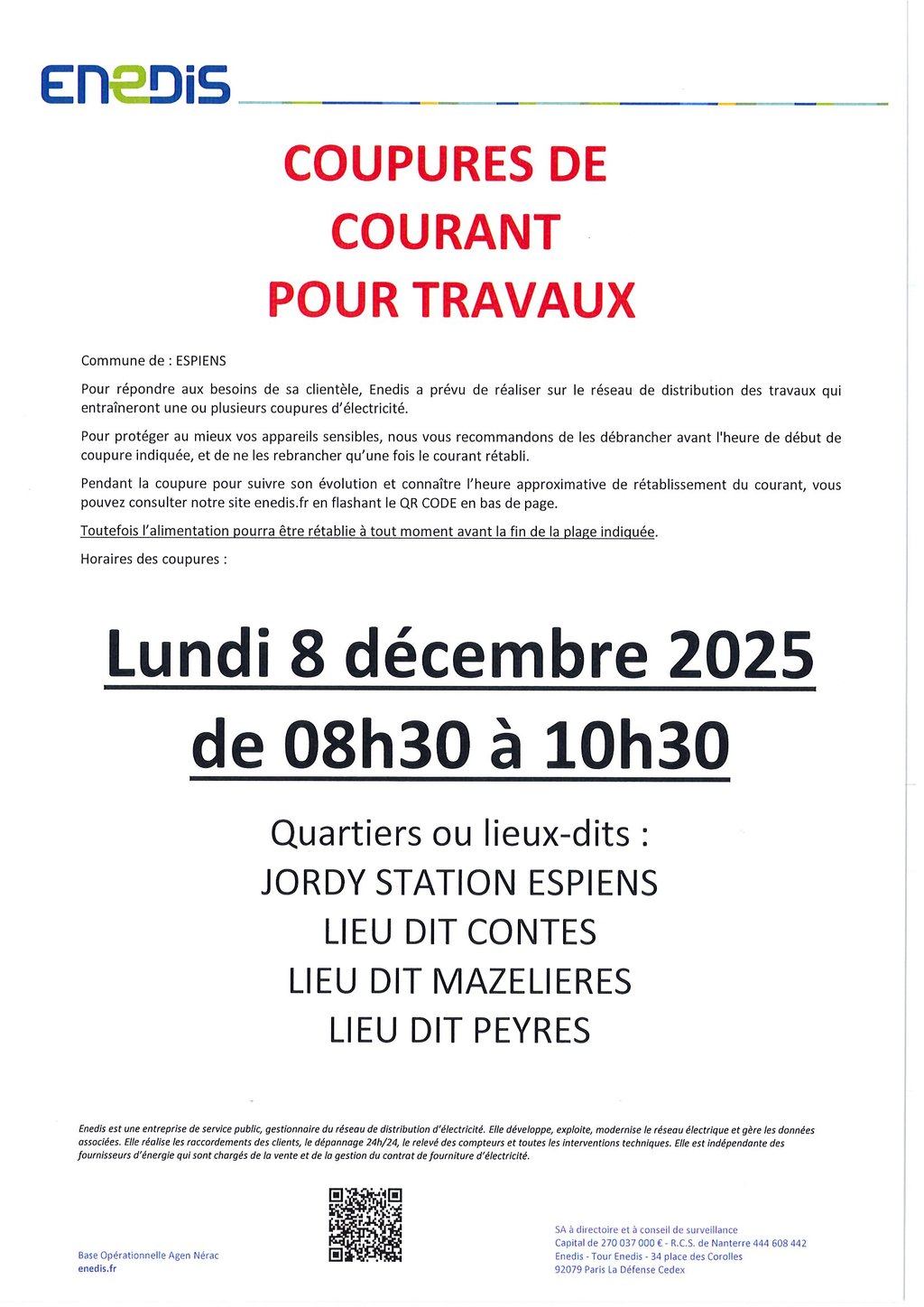 ENEDIS VOUS INFORME D'UNE COUPURE DE COURANT POUR TRAVAUX CONCERNANT LA COMMUNE DE ESPIENS