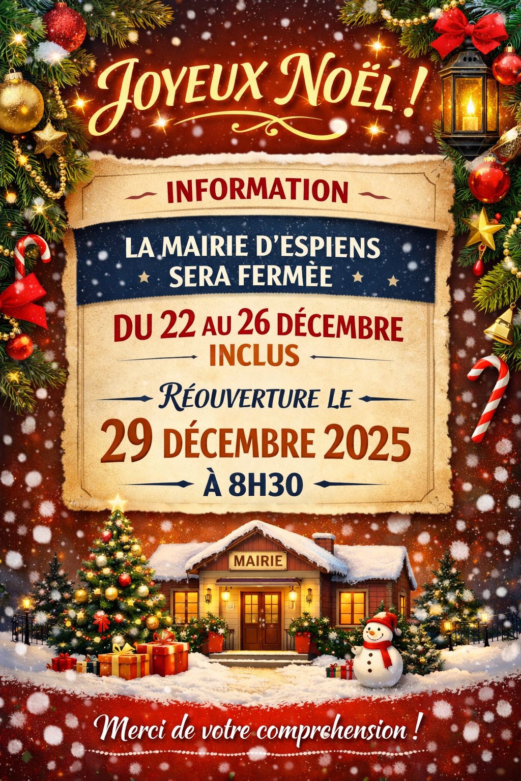 La mairie sera fermée du 22 au 26 décembre 2025, réouverture le 29 décembre 2025 à 8h30